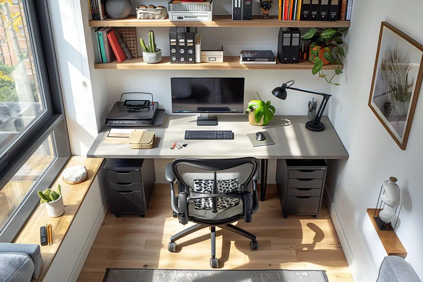 Comment faire ? Commencez par choisir un coin près de la fenêtre pour bénéficier de la lumière naturelle. Utilisez une table de petite taille adaptée à l’espace disponible. Pour les rangements, optez pour des étagères murales pour gagner de la place au sol. Enfin, choisissez une chaise ergonomique pour assurer votre confort pendant les longues heures de travail.